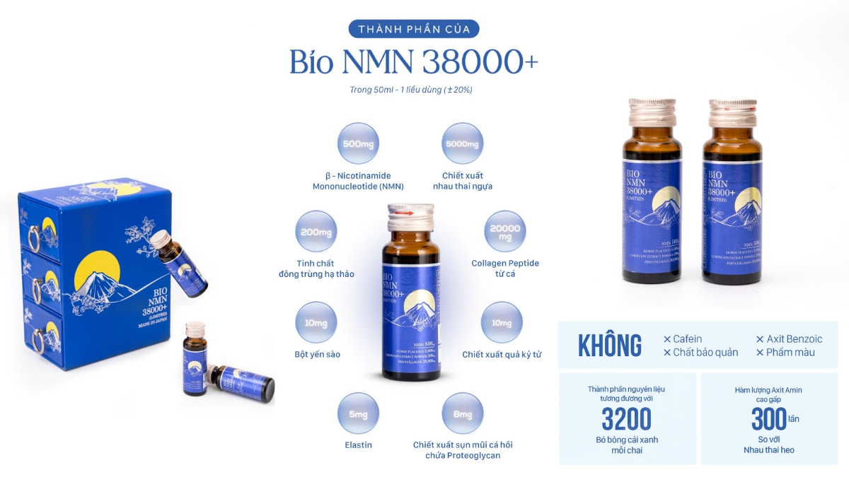 Để chống lại quá trình này, việc bổ sung NMN, một phân tử quan trọng trong quá trình sản sinh NAD+ là vô cùng cần thiết. NMN giúp kích thích sản sinh collagen và elastin, từ đó làm chậm quá trình lão hóa, cải thiện độ đàn hồi và săn chắc cho da. Sản phẩm BIO NMN LIMITED 38000+ với hàm lượng NMN cao nhất trên thị trường hiện nay, được kết hợp từ các thành phần dưỡng da quý giá, sẽ hỗ trợ duy trì làn da trẻ trung, rạng rỡ một cách tối ưu và hiệu quả. Vậy NMN và sản phẩm Bio NMN Limited 38000+ là gì?